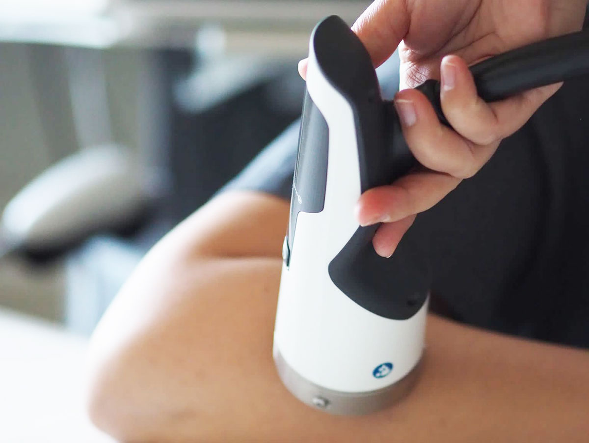 Prinzip: Erzeugung von Schallwellen außerhalb des Körpers. Diese werden über eine Linse gebündelt und als Stoßwelle auf einen Schmerz-Fokus gerichtet (z.B. ein Kalkherd in der Schultermuskulatur). Die wegweisende Modularität unserer DUOLITH® SD1 »ultra« Stoßwellengeräte verbindet Therapie, Diagnose, Information und Navigation in idealer Weise. In diesen modernsten Geräten sind Ultraschall zur präzisen Diagnostik und Therapiesteuerung, hochenergetische Stoßwelle (z.B. zur Behandlung von Verkalkungen), radiale Stoßwelle (z.B. zur Triggerpunktbehandlung) und ein spezieller Schallkopf zur Muskelentspannung (V-Actor) in einem Gerät integriert. Gezielter kann man eine individuell maßgeschnei¬derte Therapie nicht durchführen.